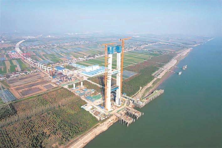 据了解,大桥上层为高速公路、下层中间为高速铁路,两侧为一级城市道路,要满足“一桥三用”,作为大桥“脊梁”的桥塔是建设关键。大桥北岸索塔高215.5米,下宽上窄,施工难度较大。为此,项目投入两台新一代轻型智能“整体式自适应智能顶升桥塔平台”,俗称“造塔机”。